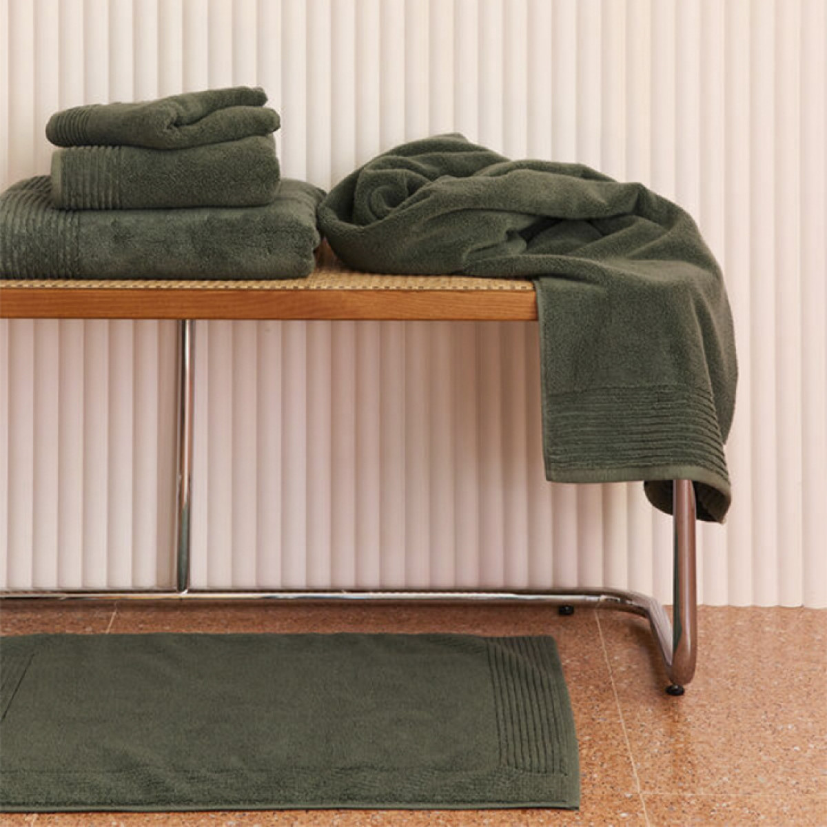 Ультра-мягкий ковер для ванной комнаты от Desforges Paris (Дефорж Париж) выполнен из длинноволокнистого органического хлопка по инновационной технологии щадящего кручения махровой нити – low swist. Инновация от Desforges Paris позволяет сохранить уникальный объем махрового полотна при существенно меньшем весе изделия.