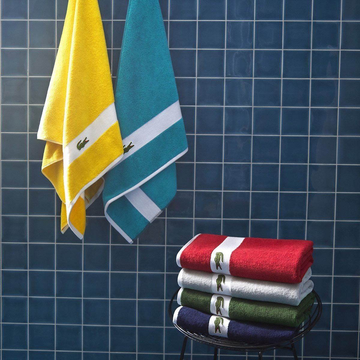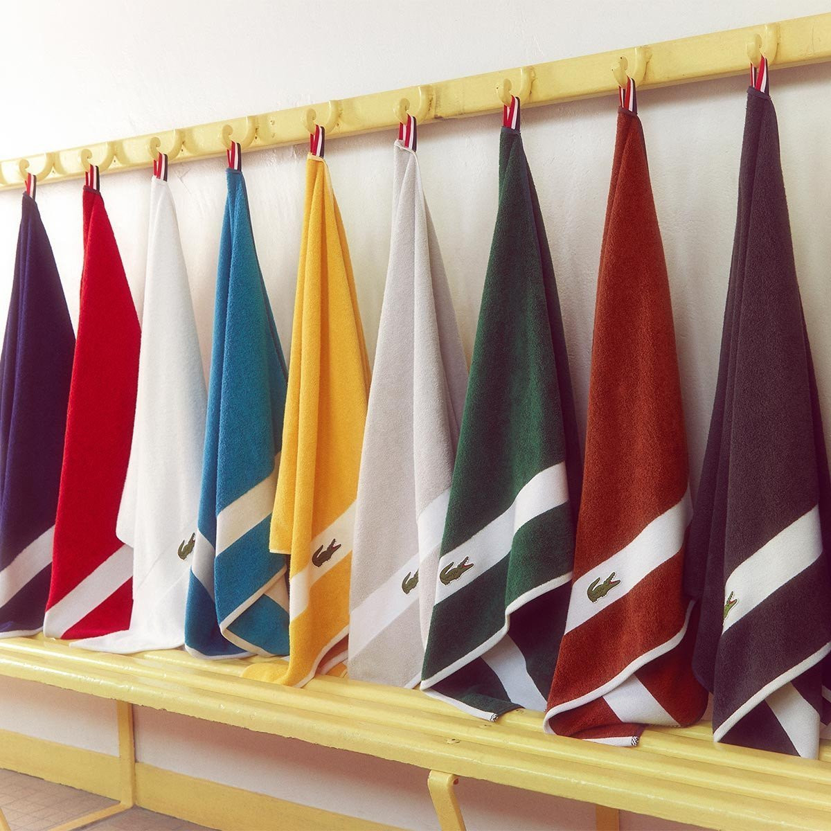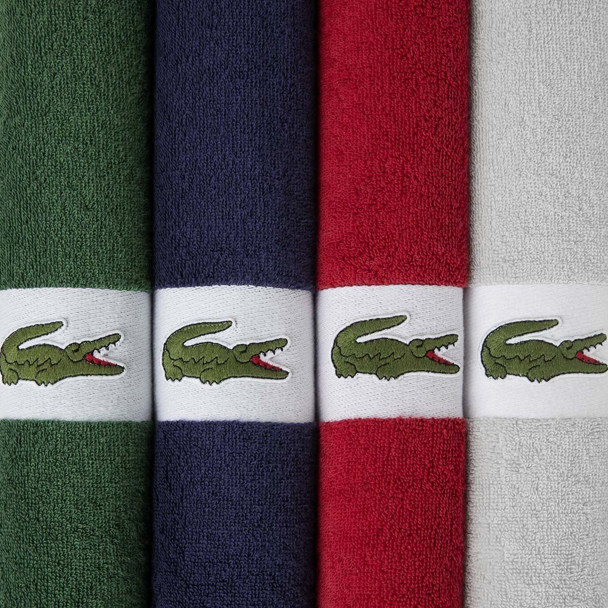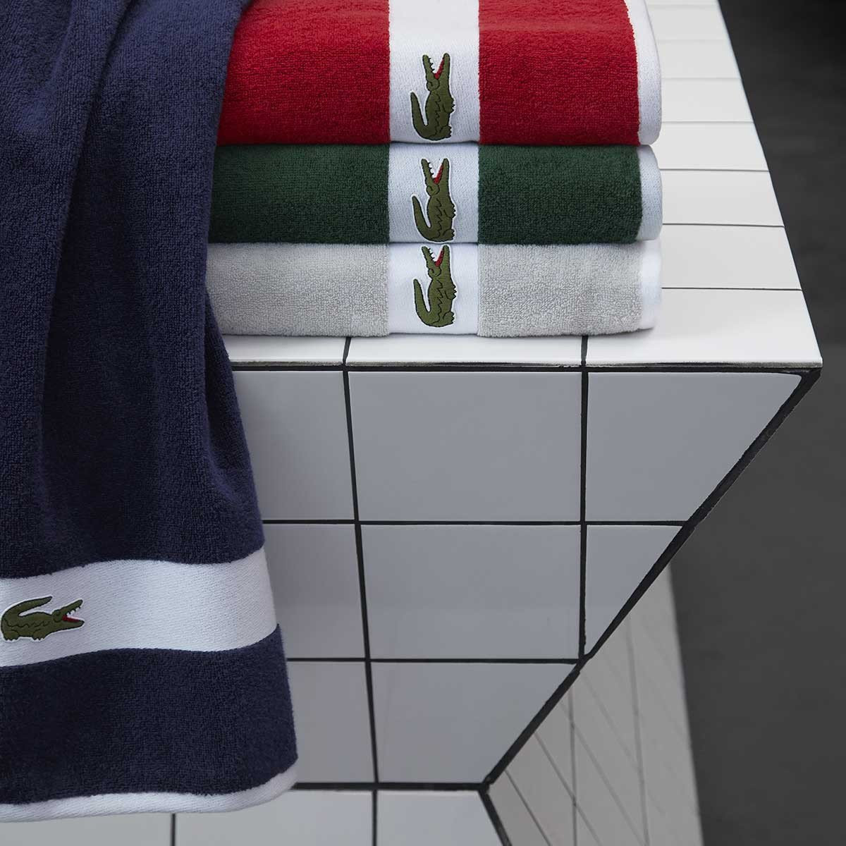 Каждое полотенце дополнено надежной хлопковой петлей для подвешивания в триколоре Lacoste.