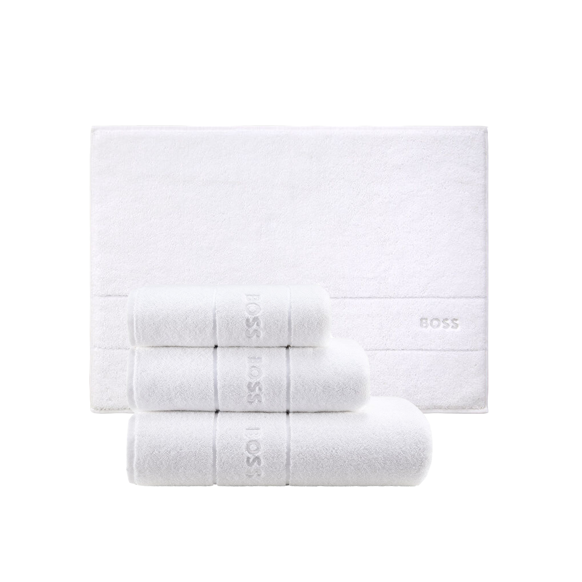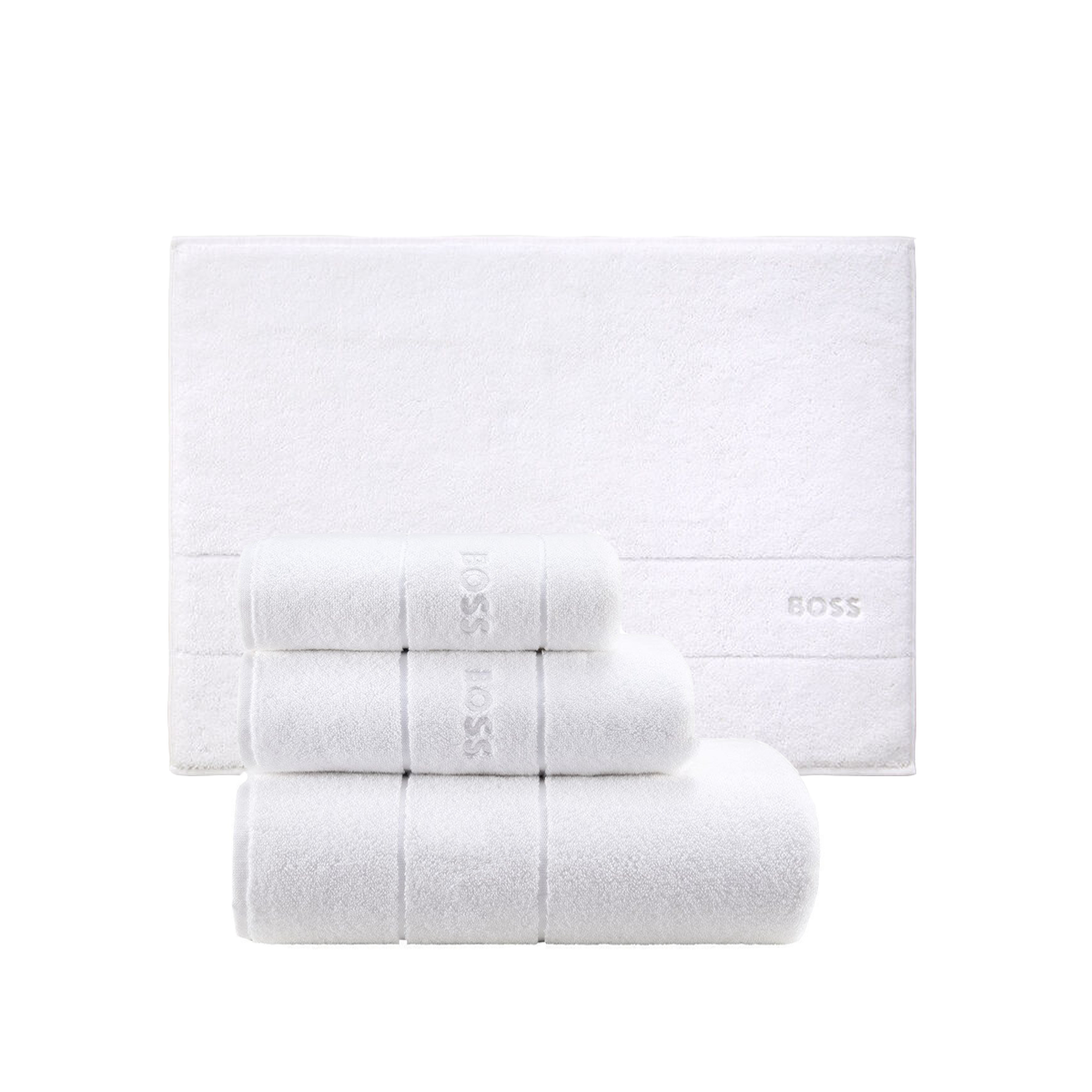 Полотенца Plain от BOSS доступны как отдельно, так и комплектом из 3х полотенец, с ковром для ванной или без, по специальной цене.