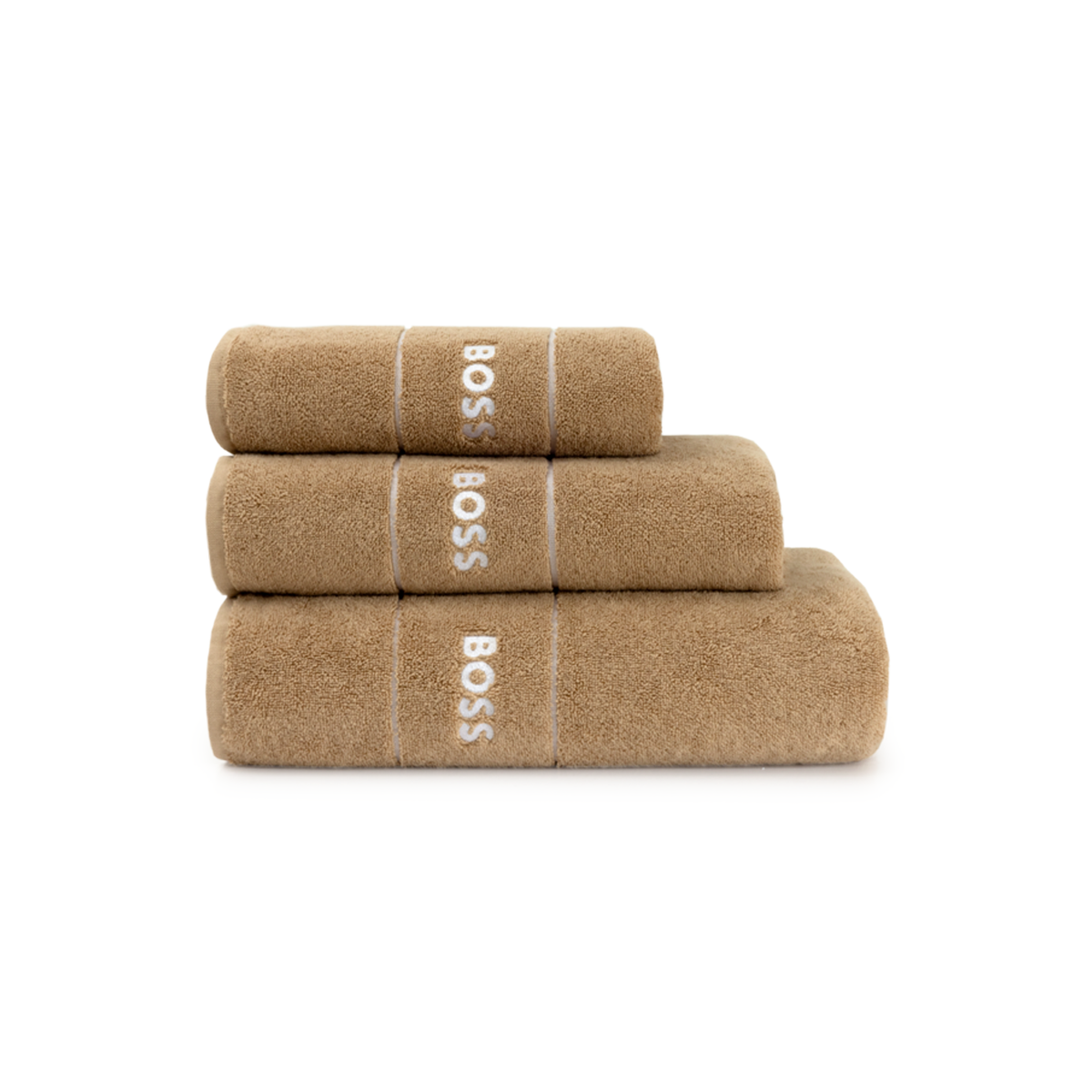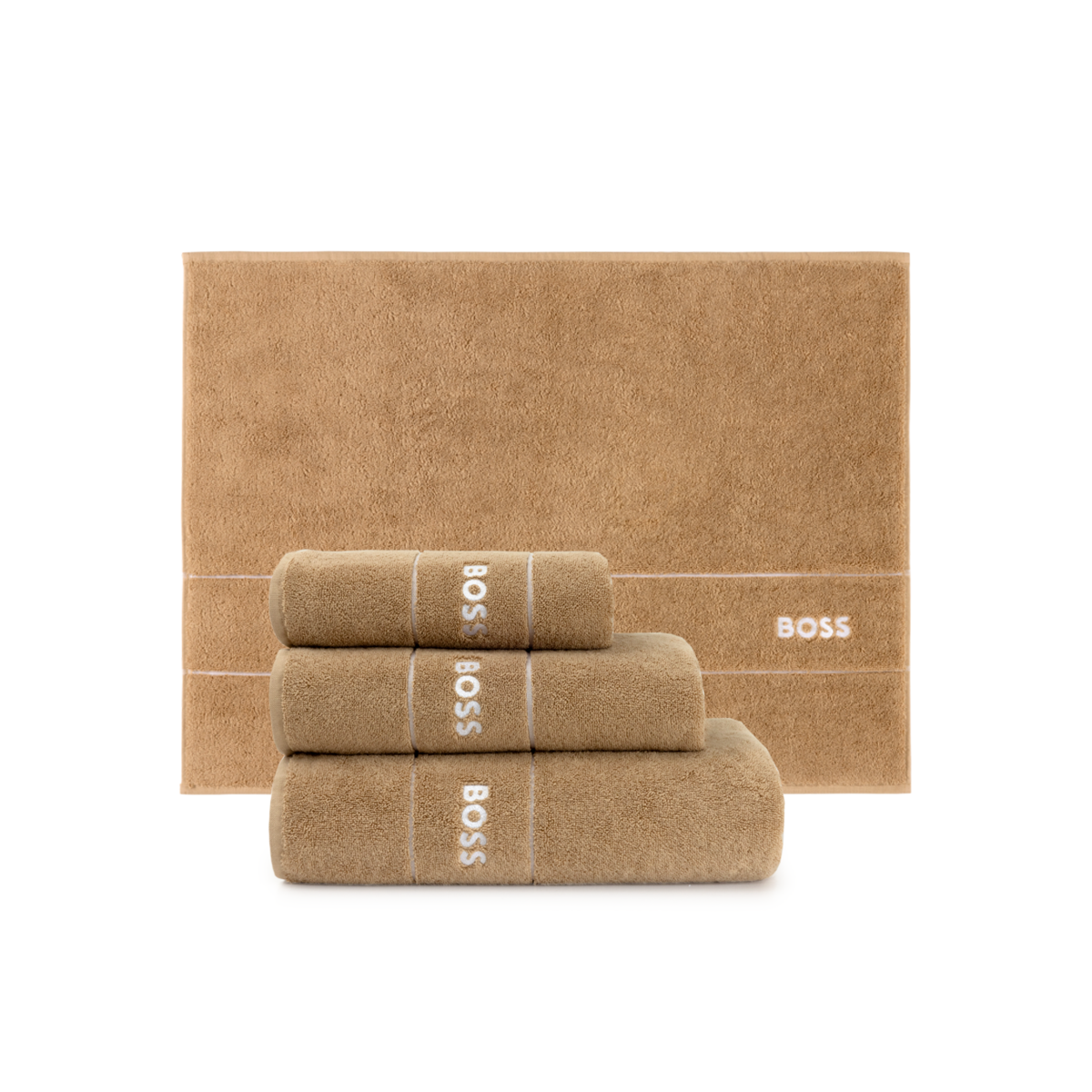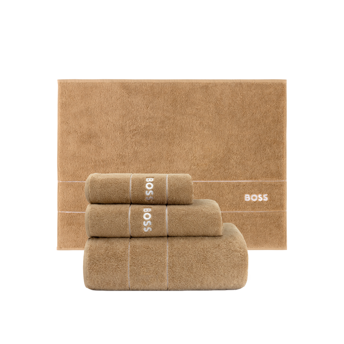 Полотенца Plain от BOSS доступны как отдельно, так и комплектом из 3х полотенец, с ковром для ванной или без, по специальной цене.