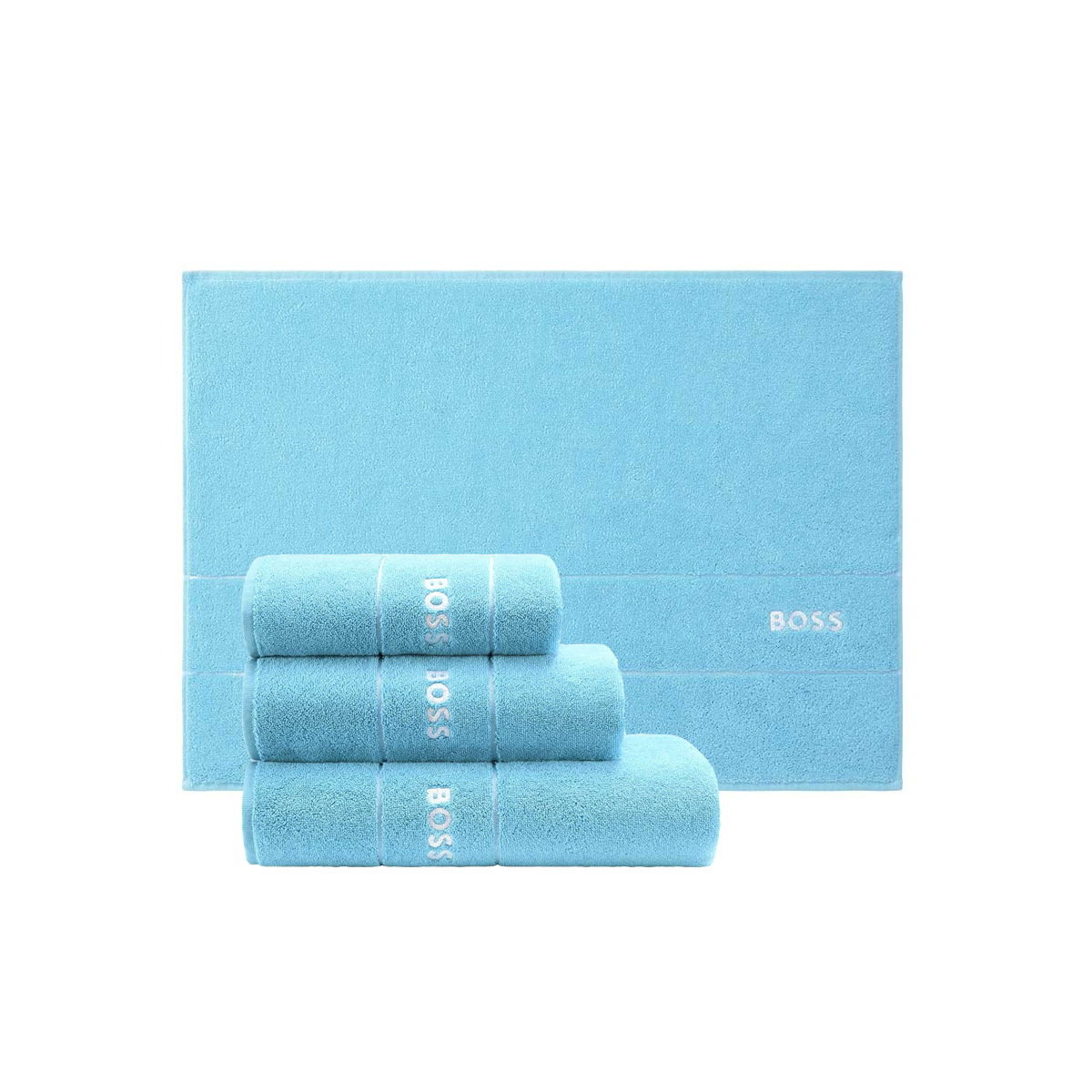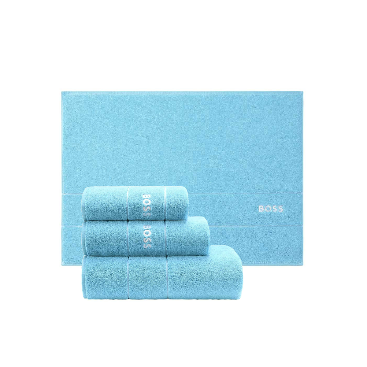 Полотенца Plain от BOSS доступны как отдельно, так и комплектом из 3х полотенец, с ковром для ванной или без, по специальной цене.