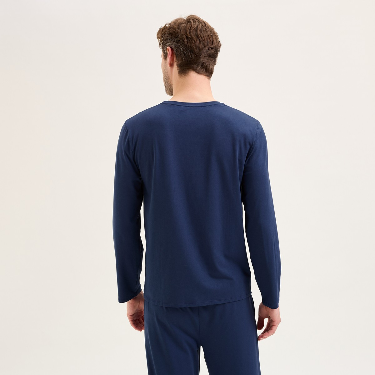 Классическая трикотажная пижама с длинным рукавом. Модель выполнена в мягчайшей эластичной смеси хлопка и модала в спокойном и уверенном цвете Classic Blue – классическом синем. Удобная трикотажная футболка с комфортной длиной рукава по запястье. Брюки с эластичной талией и удобными вшивными боковыми карманами. Наша модель ростом 185см и носит размер М. Трикотаж. Состав: 47% хлопок, 46% модал, 7% эластан. СТАНДАРТ 100 от OEKO-TEX® - сертификат гарантирует отсутствие веществ, которые вредны или могут представлять опасность для здоровья.  Сертификат гарантирует отсутствие веществ, которые вредны или могут представлять опасность для здоровья. Подарочная упаковка включена в доставку.