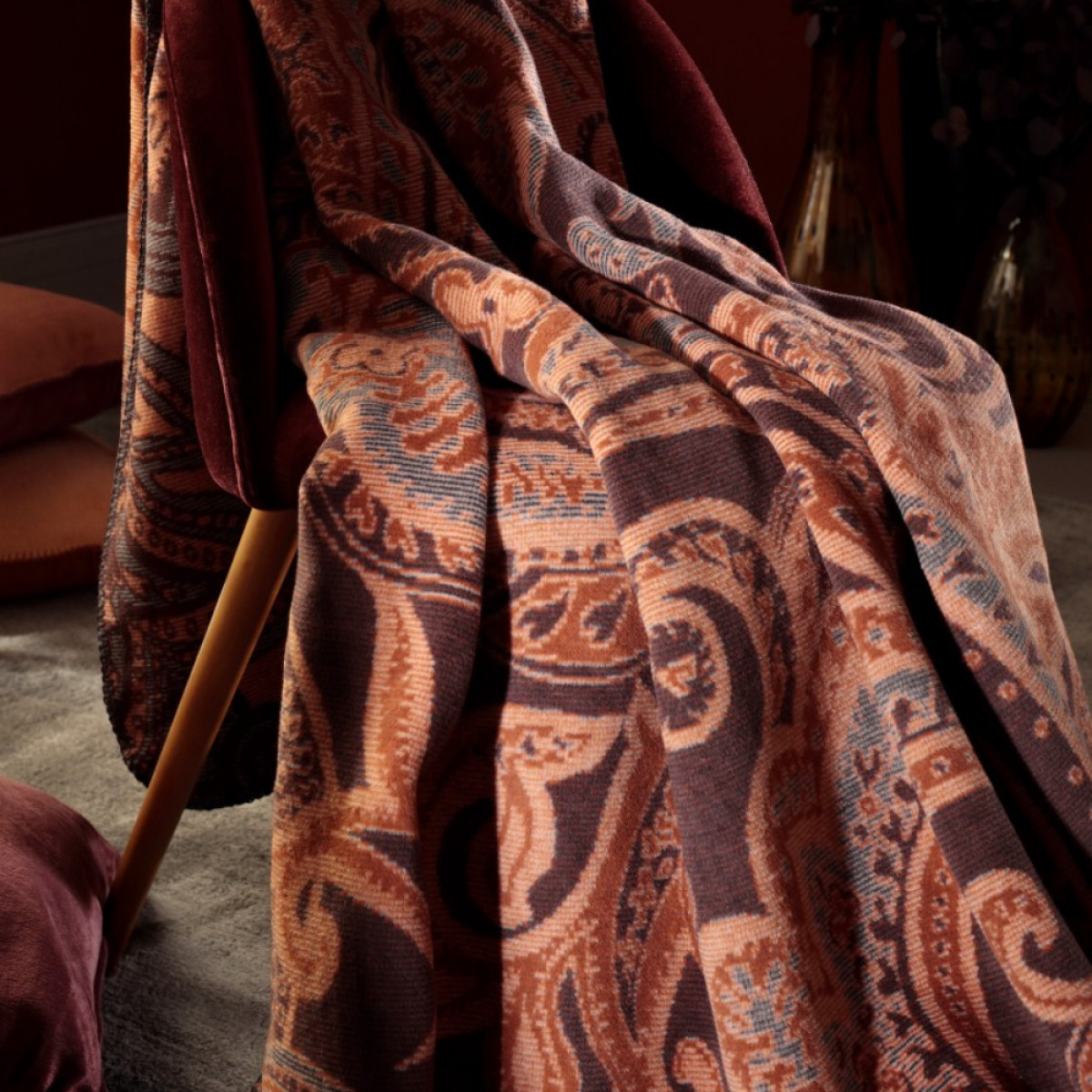 Всегда актуальный мотив Пейсли выполнен в щедром формате. Исключительно теплые оттенки охры и бургунди подчеркивают благородство и изысканность старинного орнамента.