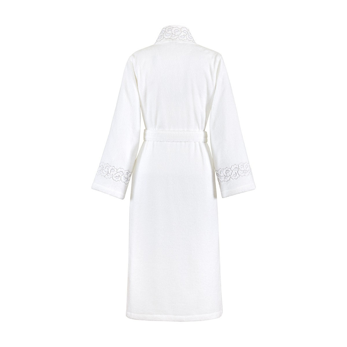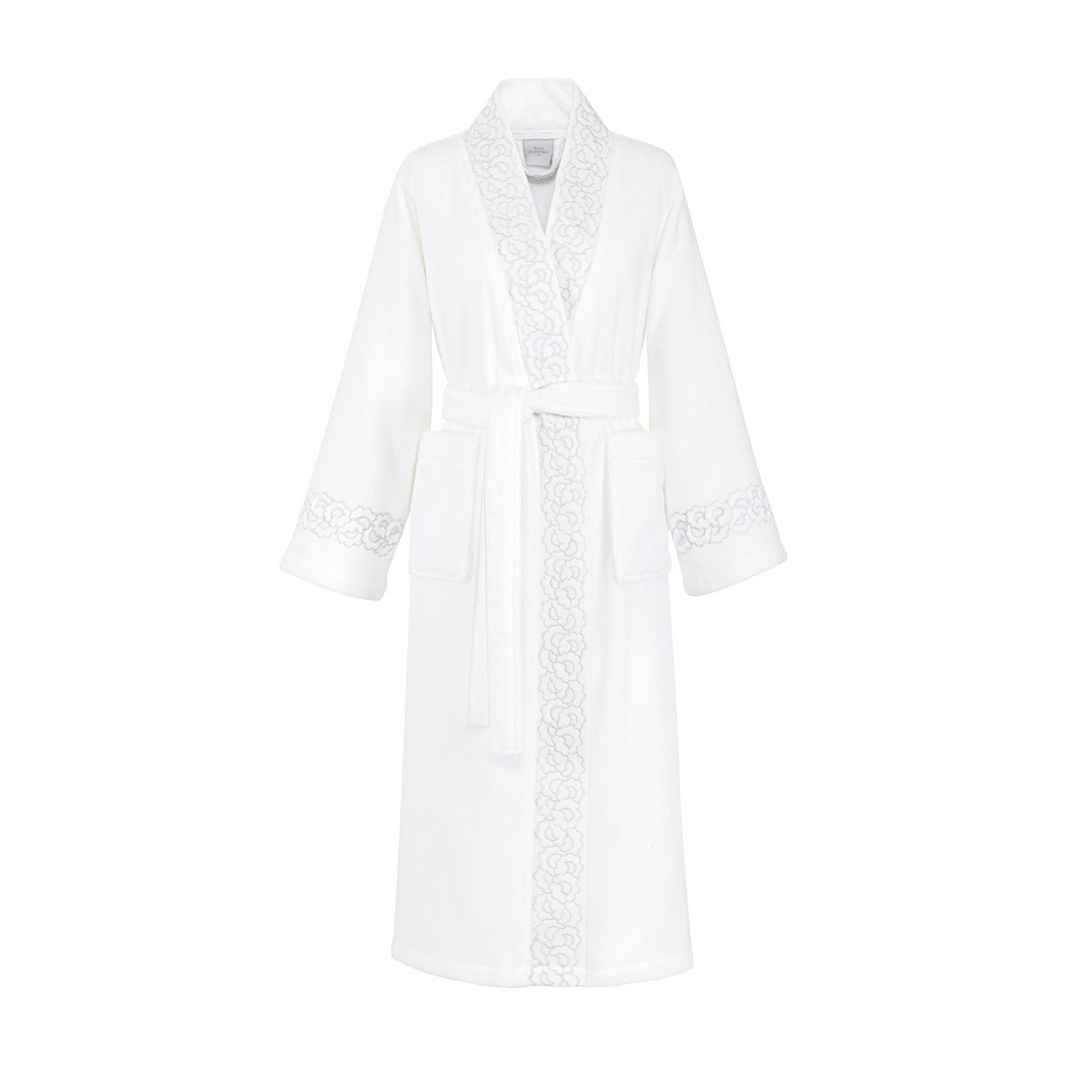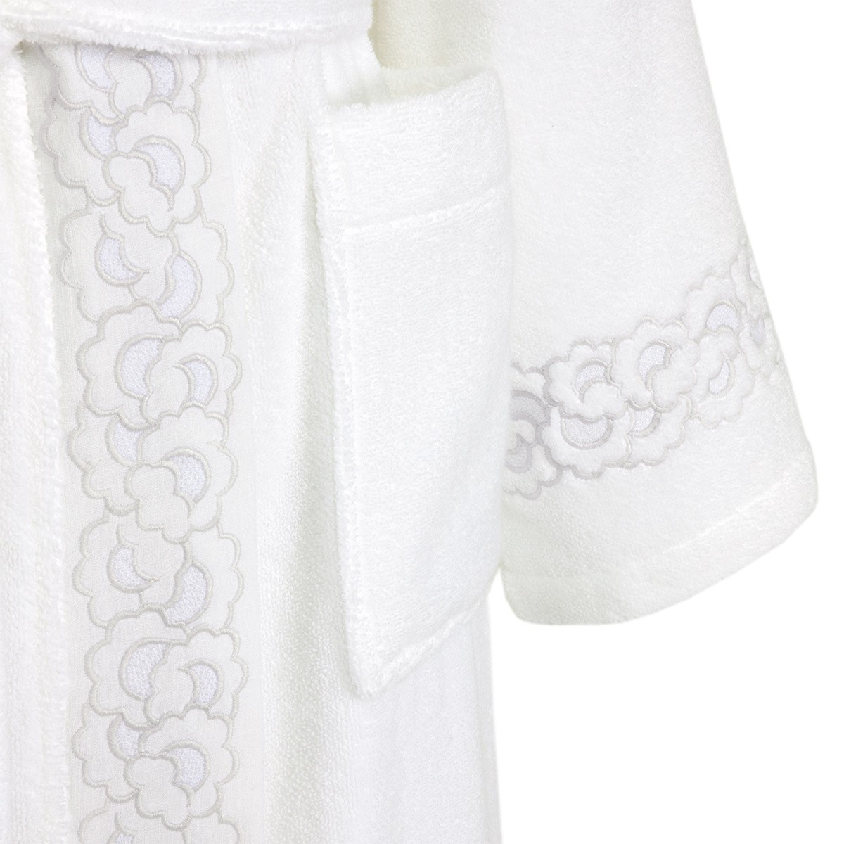 Festons (Фестон) – исключительно нежная и элегантная банная коллекция от Yves Delorme. Белоснежный халат-кимоно с щедрыми бортами, расшитыми распустившимися бутонами белого пиона. Во Франции белые пионы ассоциируются со свадебными церемониями и неувядающей молодостью. А так же признаны символом чистоты и нежности. Вышивка рукавов повторяет и поддерживает основной мотив. Два удобных накладных кармана. Халат сопровождается полотенцами в том же дизайне. 83% хлопок, 17% модал 450гр/м2 Коллекция Yves Delorme выполнена из хлопка Супима – лучшего длинноволокнистого хлопка. Супима выращивается только в США без применения инсектицидов, пестицидов, химических удобрений и других токсичных химикатов. СТАНДАРТ 100 от OEKO-TEX®  Сертификат гарантирует отсутствие веществ, которые вредны или могут представлять опасность для здоровья. Подарочная упаковка включена в доставку.