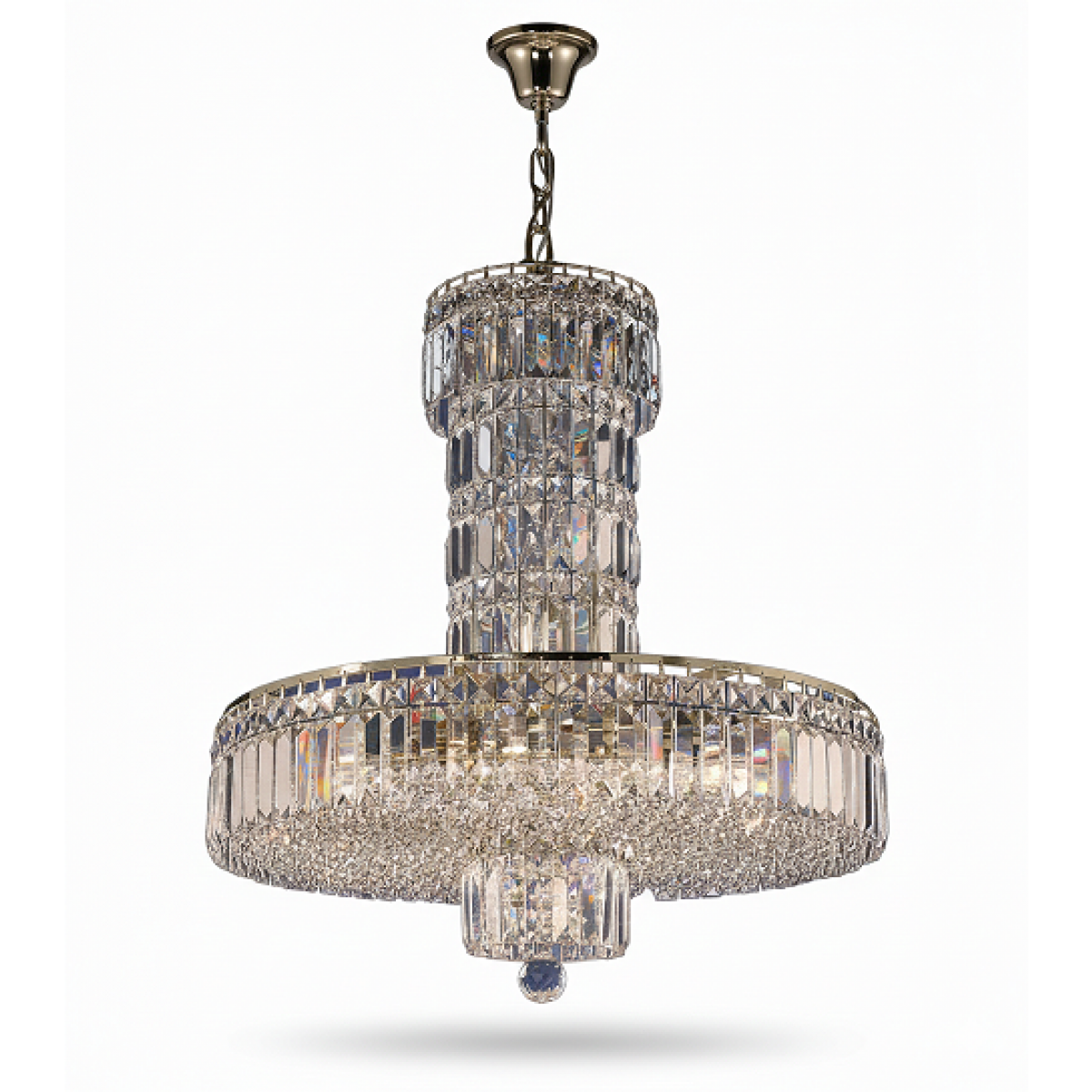 Основание люстры полностью закрыто чередующимися хрустальными пиками и октагонами. Периметр люстры декорирован чередующимися хрустальными пиками и октагонами.