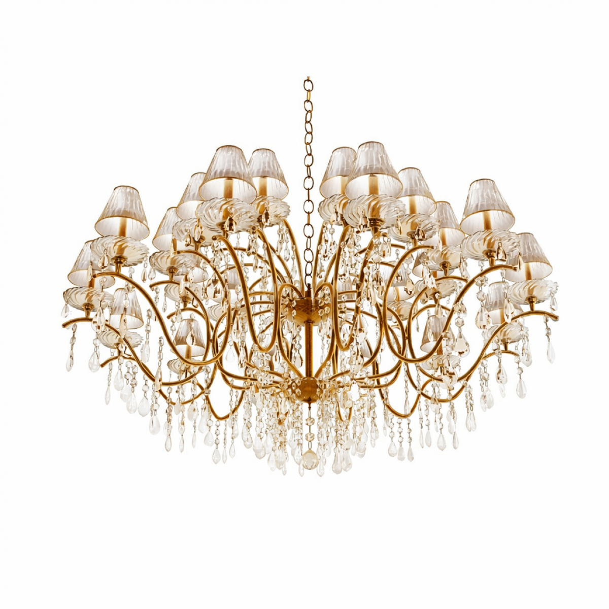 Каркас люстры выполнен из шлифованного матового железа старинного золотого цвета для придания аутентичности.