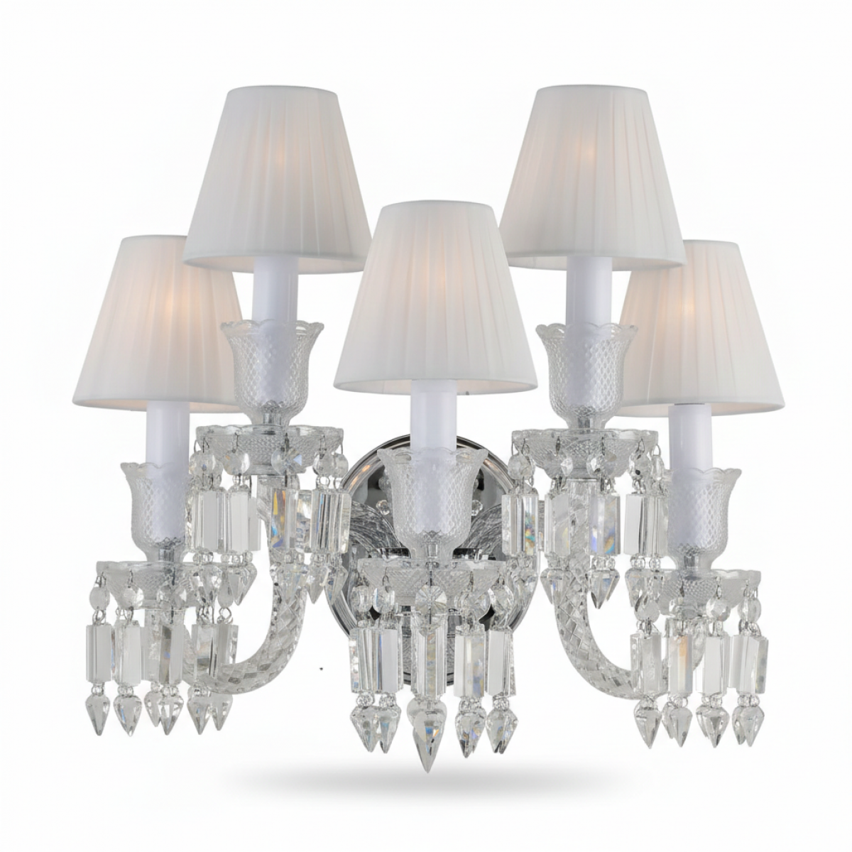 Пять чаш подсвечников с огранкой Каре (рельефная сетка) украшены фестонами как лепестками цветка, к которым крепятся многогранные подвески «Остроконечная Пика» через хрустальные октагоны.