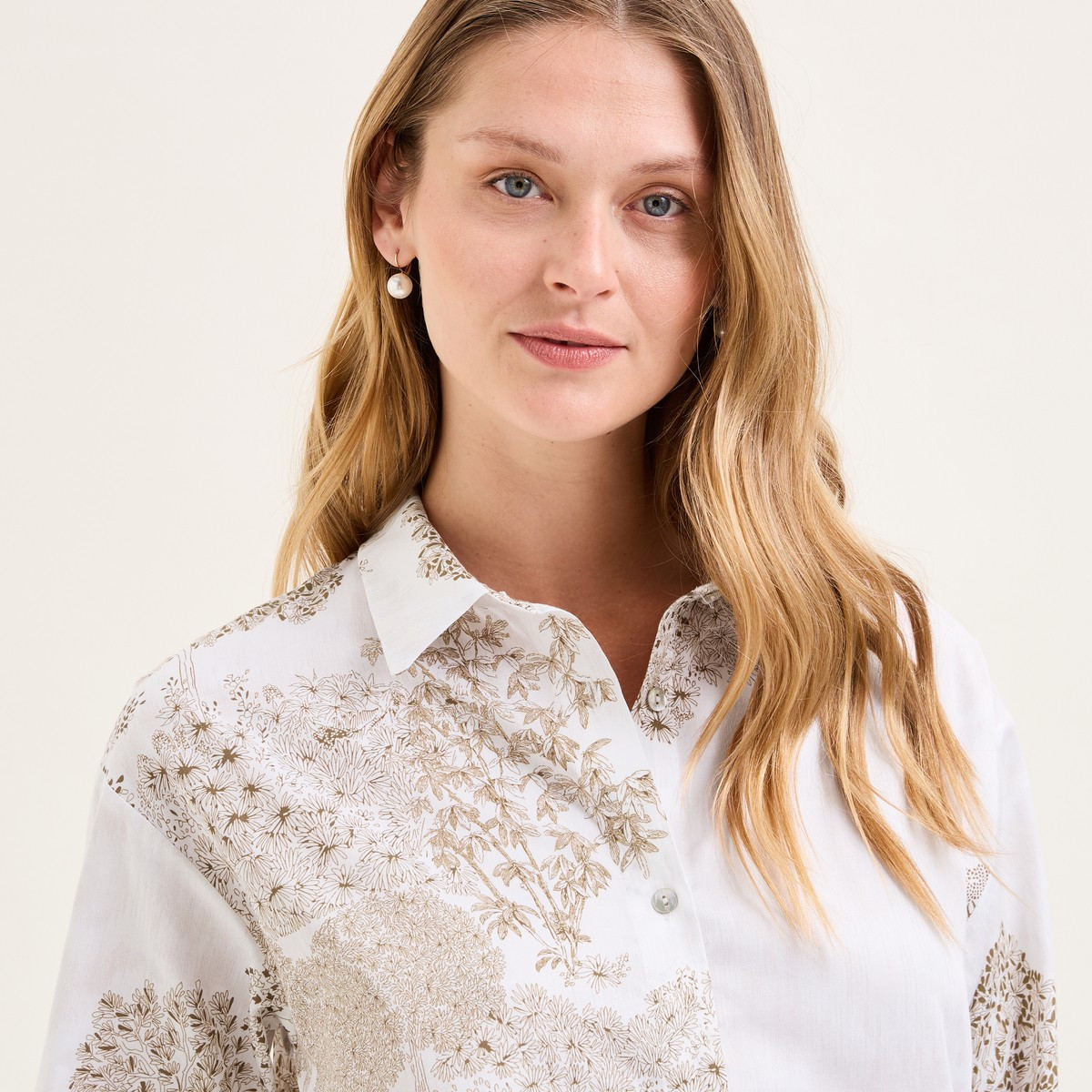 Рубашка с отложным воротником и удобной длиной рукава по запястье декорирована перламутровыми пуговицами.
