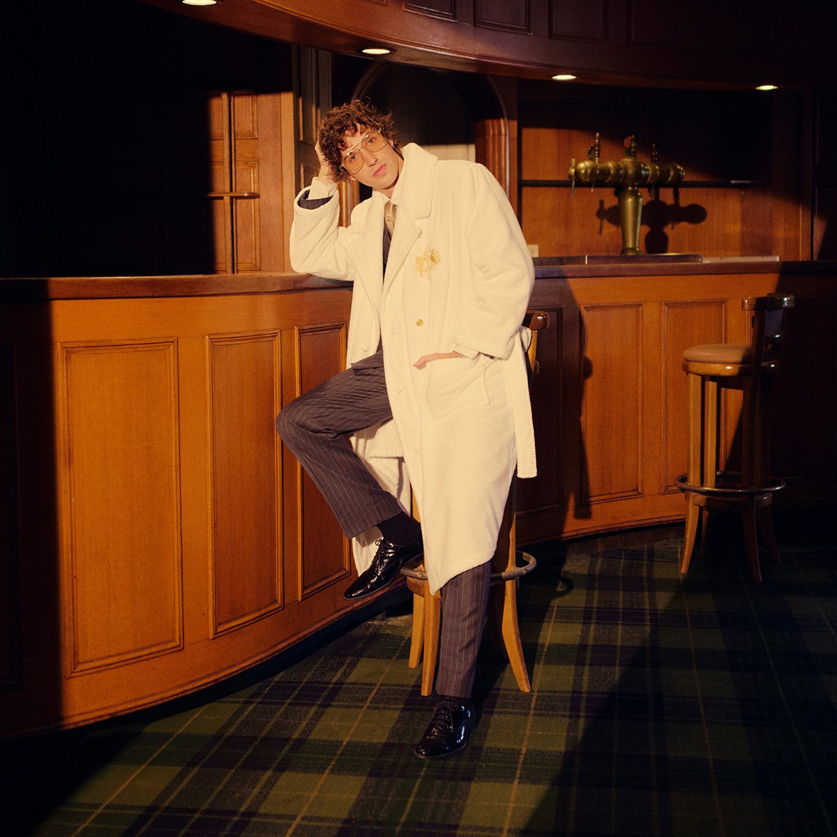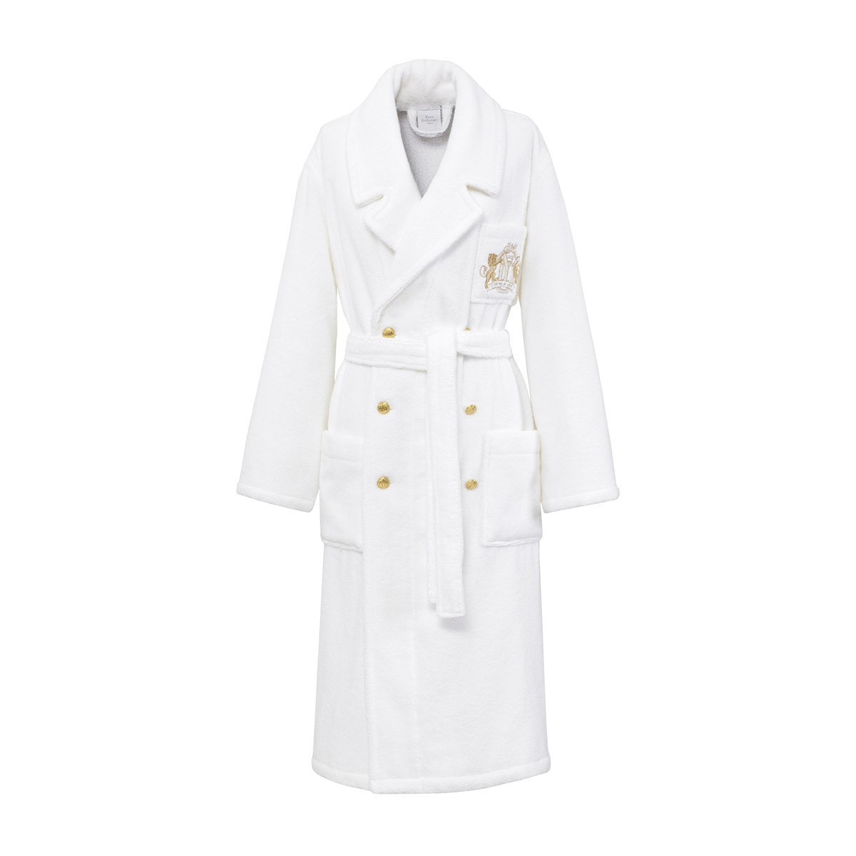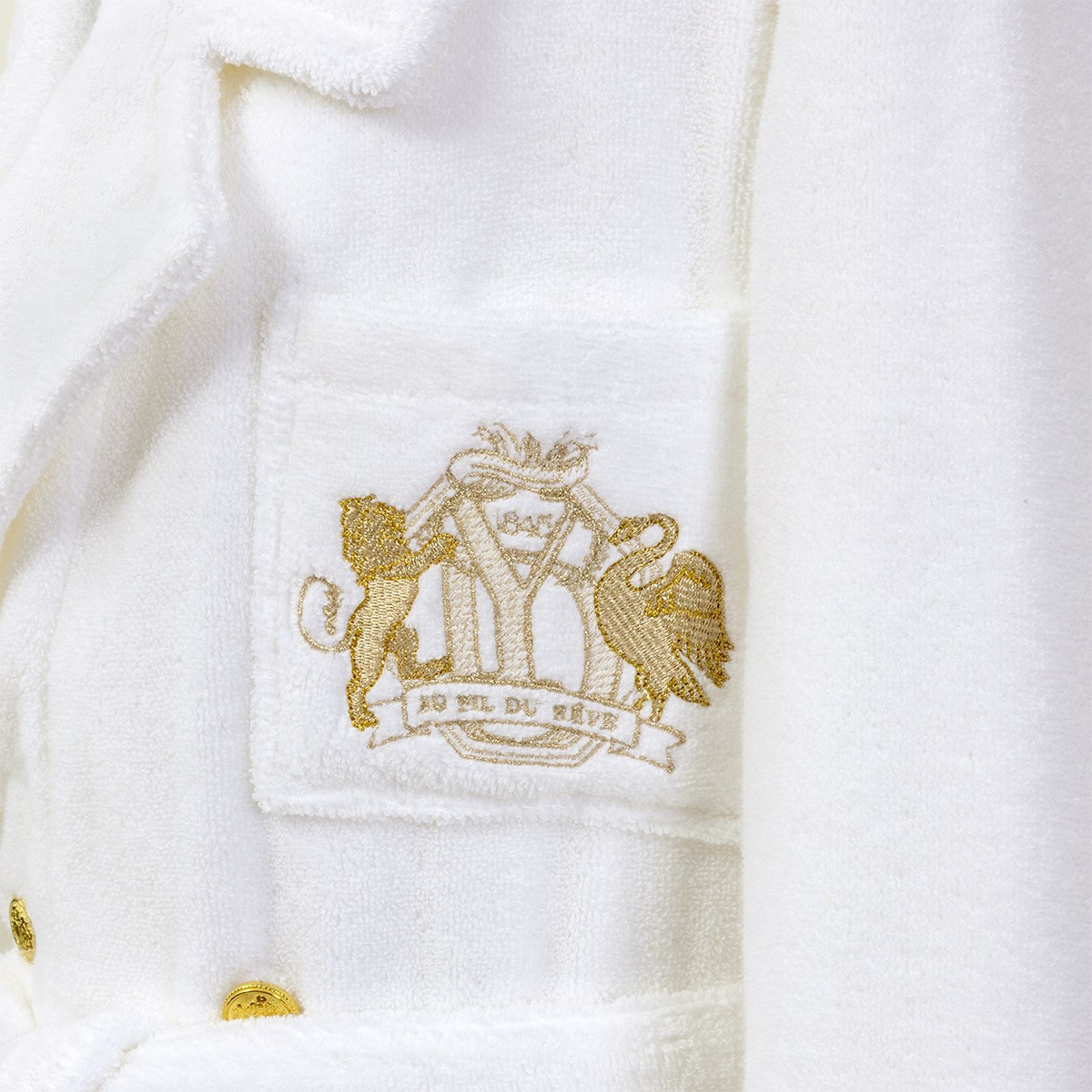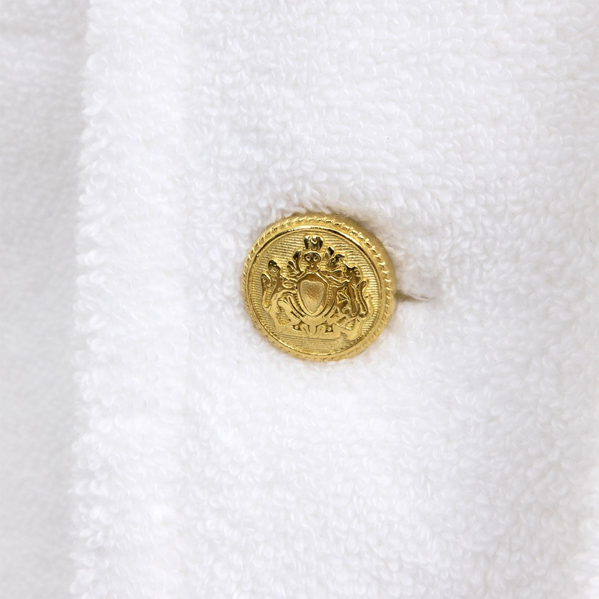 Белоснежный двубортный домашний халат с щедрым английским воротником и золотыми пуговицами.