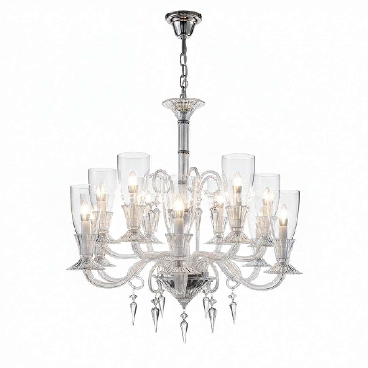 Люстра украшена изящными хрустальными стеблями и удлинёнными остроконечными пиковыми подвесками.